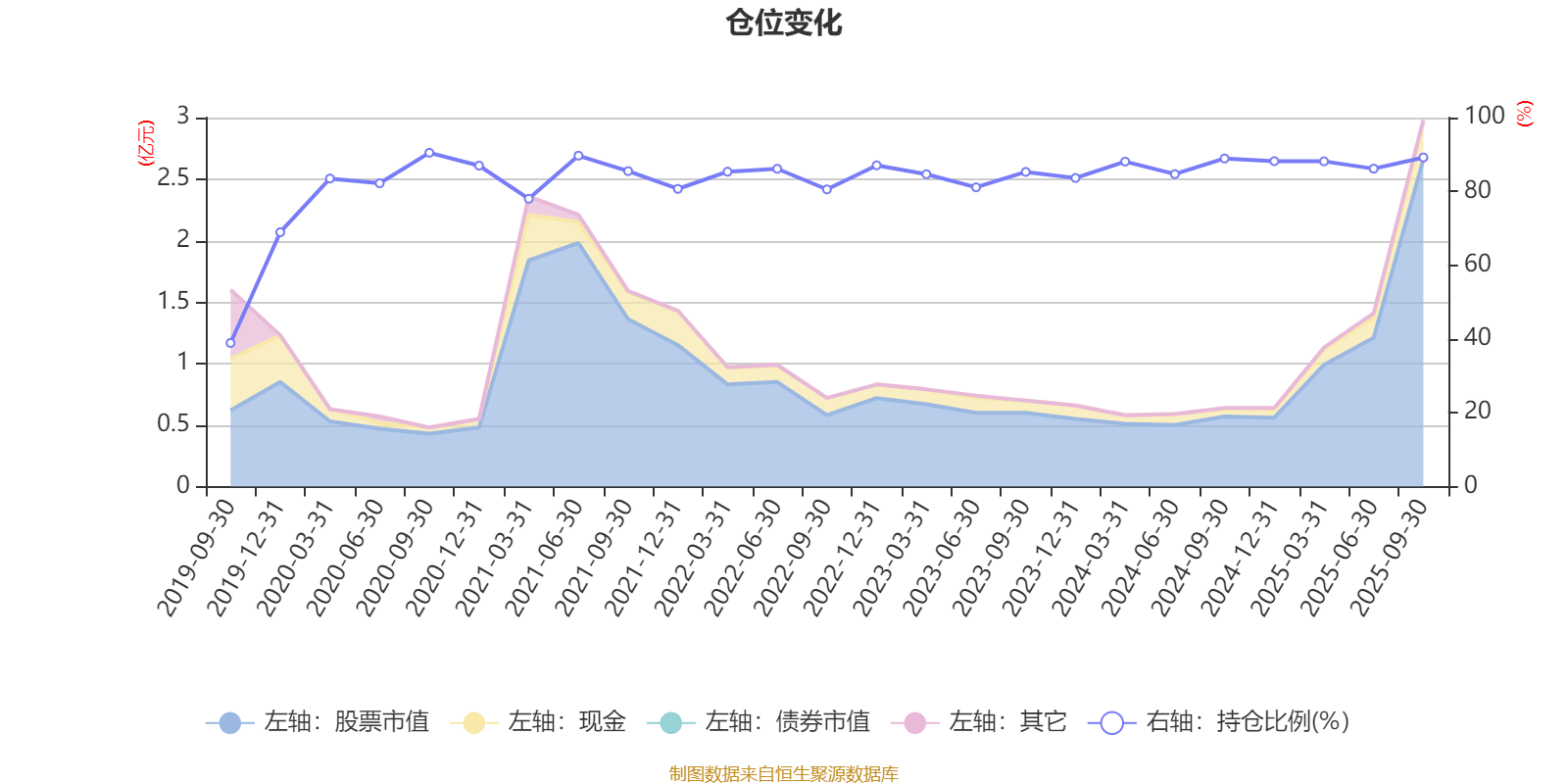 据定期报告数据统计,近三年平均股票仓位为86.26%,同类平均为83.37%。2020年三季度末基金达到90.48%的最高仓位,2019年三季度末最低,为38.92%。