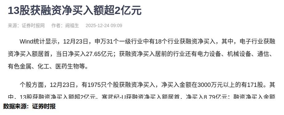 2025-12-26股票推荐,今日牛股,短线股票推荐,明日股票推荐,热门板块分析/每日精选A股潜力牛股,覆盖短线爆发股与长线价值股,附技术图形、资金动向与题材热点分析,助您提前抓住风口,精准进场!最近股市里不少人盯着融资数据看——毕竟真金白银往里砸的方向,总该有机会吧?可身边朋友却念叨:“明明电子、电力设备这些行业融资买得凶,我手里的股怎么就是不涨?”其实这个问题,早藏在“指数涨了钱没赚”的老麻烦里了。12月23日(周二)Wind统计显示,申万31个一级行业里18个获融资净买入,电子行业净买入27.65亿元排第一,寒武纪-U、英维克这些个股净买入超2亿。可看着这些数字,有人高兴有人懵:融资砸进去的钱,怎么没落到自己账户里?别急,文章最后我会说清这个新闻背后的关键,。