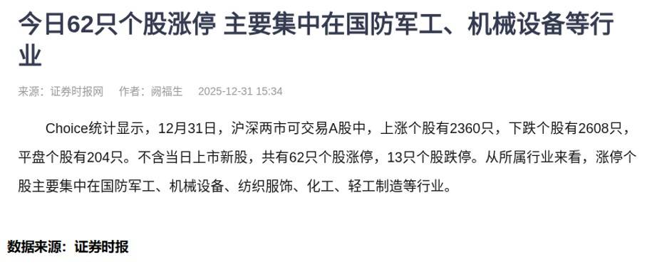 2026-01-03股票推荐,今日牛股,短线股票推荐,明日股票推荐,热门板块分析/每日精选A股潜力牛股,覆盖短线爆发股与长线价值股,附技术图形、资金动向与题材热点分析,助您提前抓住风口,精准进场!12月31日,市场呈现明显的分化格局。Choice数据显示,当天上涨的股票有2360只,下跌的则有2608只,平盘204只。剔除新股,涨停个股62只,跌停13只。从行业分布看,涨停股主要集中在国防军工、机械设备、纺织服饰等行业。这组数据很直观地告诉我们,即便在同一个交易日,市场的“温度”也是不均匀的,有的地方热火朝天,有的地方却冷冷清清。这不禁让我思考,面对这种分化,普通投资者该如何辨别哪些是真机会,哪些只是昙花一现呢?