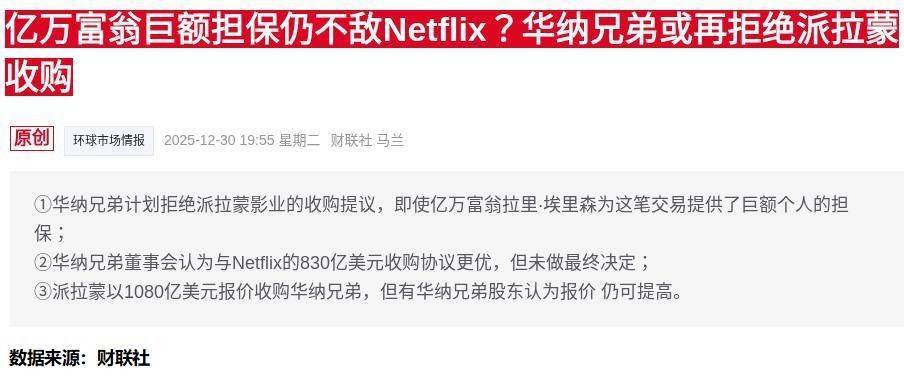 2026-01-04股票推荐,今日牛股,短线股票推荐,明日股票推荐,热门板块分析/每日精选A股潜力牛股,覆盖短线爆发股与长线价值股,附技术图形、资金动向与题材热点分析,助您提前抓住风口,精准进场!12月31日财联社的消息炸了——华纳兄弟打算拒绝派拉蒙的收购提议,哪怕甲骨文创始人埃里森给了巨额个人担保。其实华纳心里有笔账:12月初和Netflix签的830亿协议更合心意,但分析师却泼了冷水:派拉蒙赢的概率可能更大,因为它市场份额小,反垄断调查的风险比Netflix低,而且更需要华纳的资产。