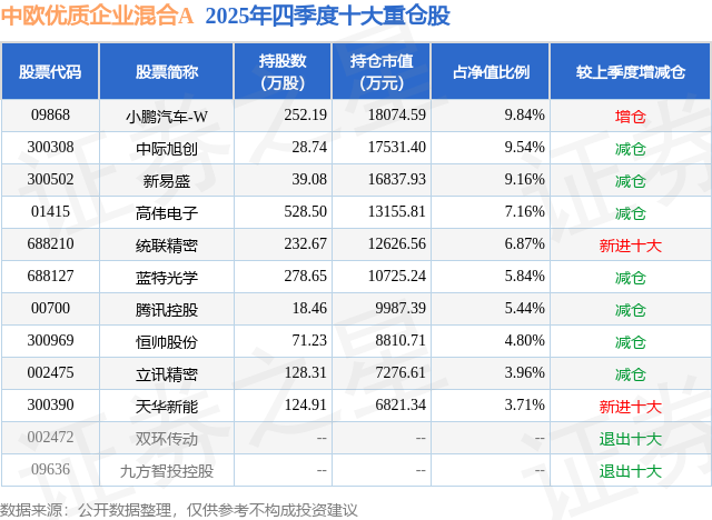 根据2025基金年报公募基金重仓股数据,重仓该股的公募基金共8家,其中持有数量最多的公募基金为中欧基金的中欧优质企业混合A。中欧优质企业混合A目前规模为17.21亿元,最新净值1.3363(2月6日),较上一交易日下跌0.8%,近一年上涨45.44%。该公募基金现任基金经理为代云锋。代云锋在任的基金产品包括:中欧洞见一年持有混合,管理时间为2022年7月7日至今,期间收益率为26.38%;中欧科技成长混合A,管理时间为2024年2月2日至今,期间收益率为100.75%。