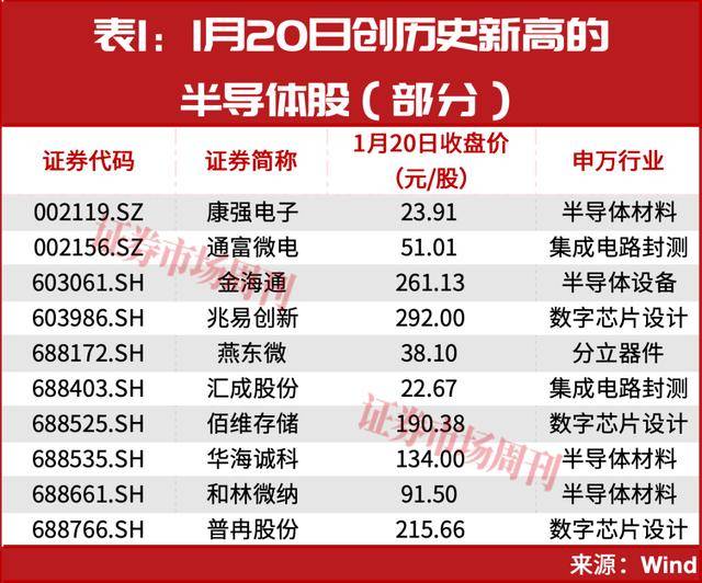 在板块集体上涨同时,一众个股在1月21日迎来强势上涨,典型个股如龙芯中科(688047)收出“20cm”涨停,通富微电、大港股份、至正股份、盈方微等一众个股均收出“10cm”涨停。另外,还有一众个股在近期扎堆创新高,如普冉股份、通富微电、金海通、兆易创新等在内的标的均在1月20日当天创出历史新高(见表1)。